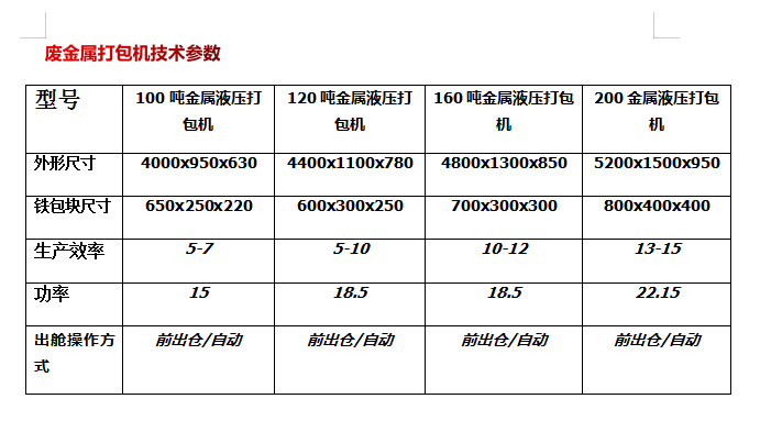 廢品金屬打包機可將各種金屬邊角料、鋼刨花屑、廢鋼、廢鐵、廢銅、廢鋁、鋁刨花屑、解體汽車殼、廢油桶等金屬原料擠壓成長方體、圓柱體等各種形狀的合格爐料。便于儲藏、運輸及回爐再利用。